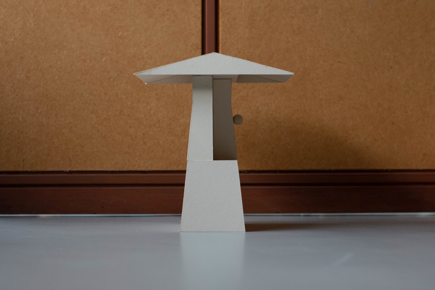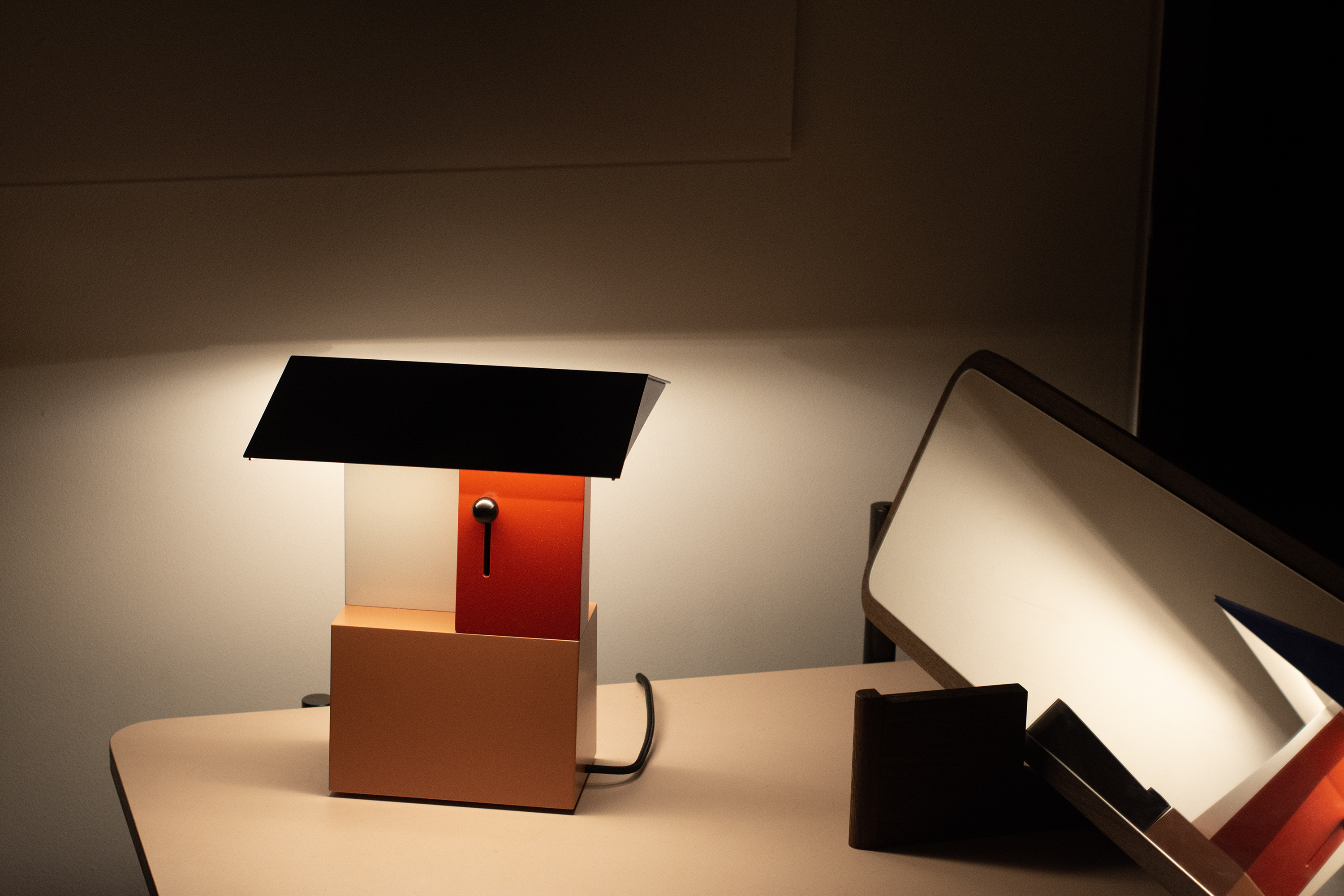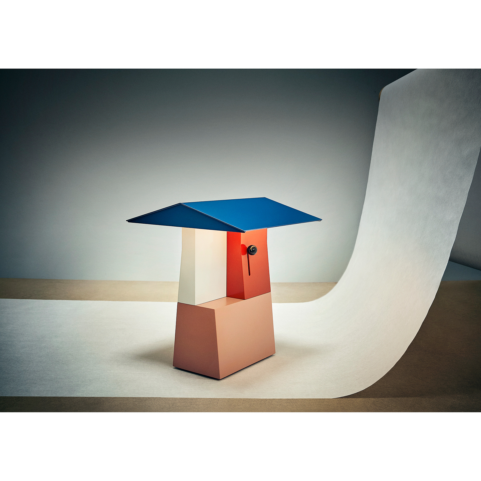 Clear lines, yet asymmetric, the lamp has a distinct, sculptural look with a close visual resemblance to a small house.