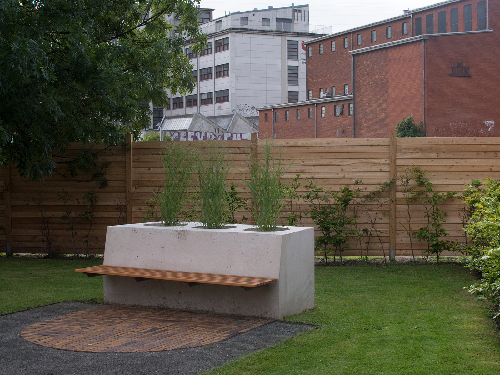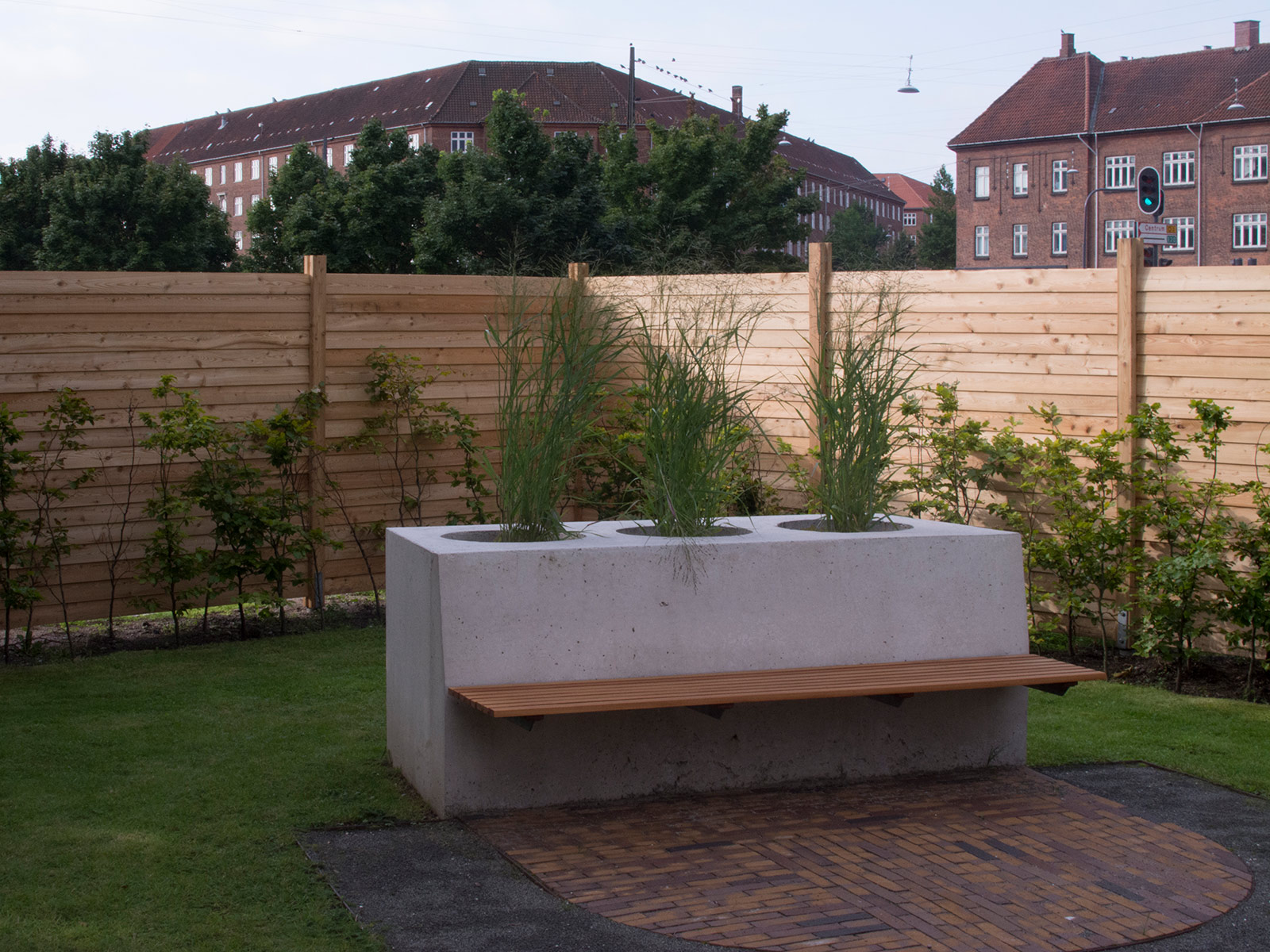 Three different concrete slabs functions as a backbone for sitting and plants. The three spaces are defined by a small plaza in a darker surface and a slightly elevated brick surface to give the feeling of being on an island.